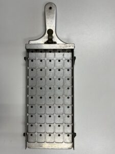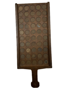 銭枡はお金を数える道具です。この3点は明治から昭和前期までに使用されて物です。右端は数えた後にボタンを押せば下に落ちる仕掛けのあるものです。江戸時代の物はまたの機会にご紹介しますね。昔、銀行でも使われていましたので懐かしい方もおられると思います。