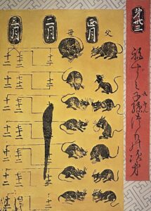 何やらねずみがたくさん書かれています。これは「塵劫記」に出てくるネズミ算の図です。<2匹のつがいのネズミの親子が1回に12匹の子供を産む。子供も親になり同じようにつがいになると次の月は7組がそれぞれ12匹を産む。これを繰り返しと1年後には何匹になるかという問題です。 式で解けば2×7の12乗で27,682,574,402匹になります。
