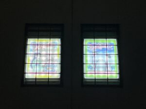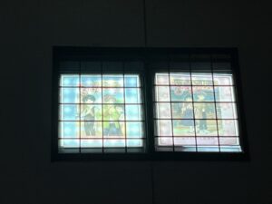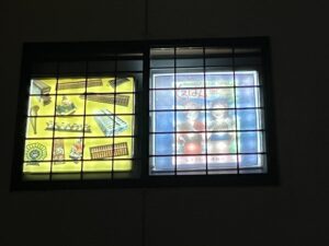 新館2Fの窓の写し絵です。PM5時30分を過ぎると点灯します。5枚は「そろばんタイムトラベラー」の表紙です。少し明るすぎて見ずらいかもしれませんが、お楽しみください。