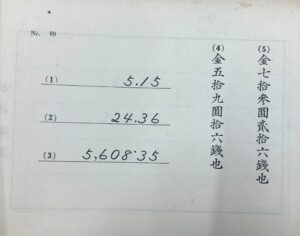 こんな伝票算が入りました。No4とNo5が漢字の縦書きです。昭和11年に発行されて中学校・高等学校用の練習伝票です。いずれも円以下銭の単位まであります。このような伝票も博物館では収集しておりますのでお持ちの方はご連絡ください。